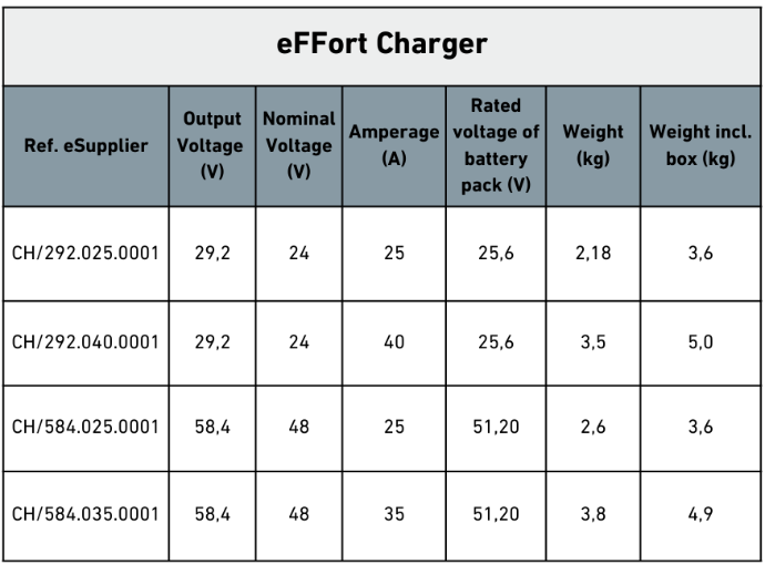 eFFort offers chargers in different voltages and capacities.
