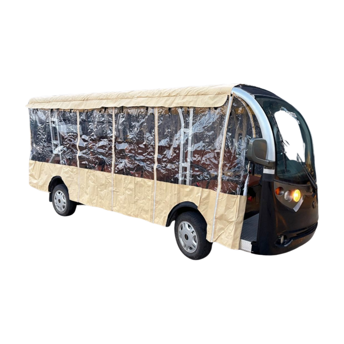 In our range of shuttles, we work with you on different seats, logos and body looks. Furthermore, the bus can be open, closed with a half-sized glass door of full-glass door. Optionally we offer open shuttlebusses with a flexbile plastic enclosure and countless possibilities.